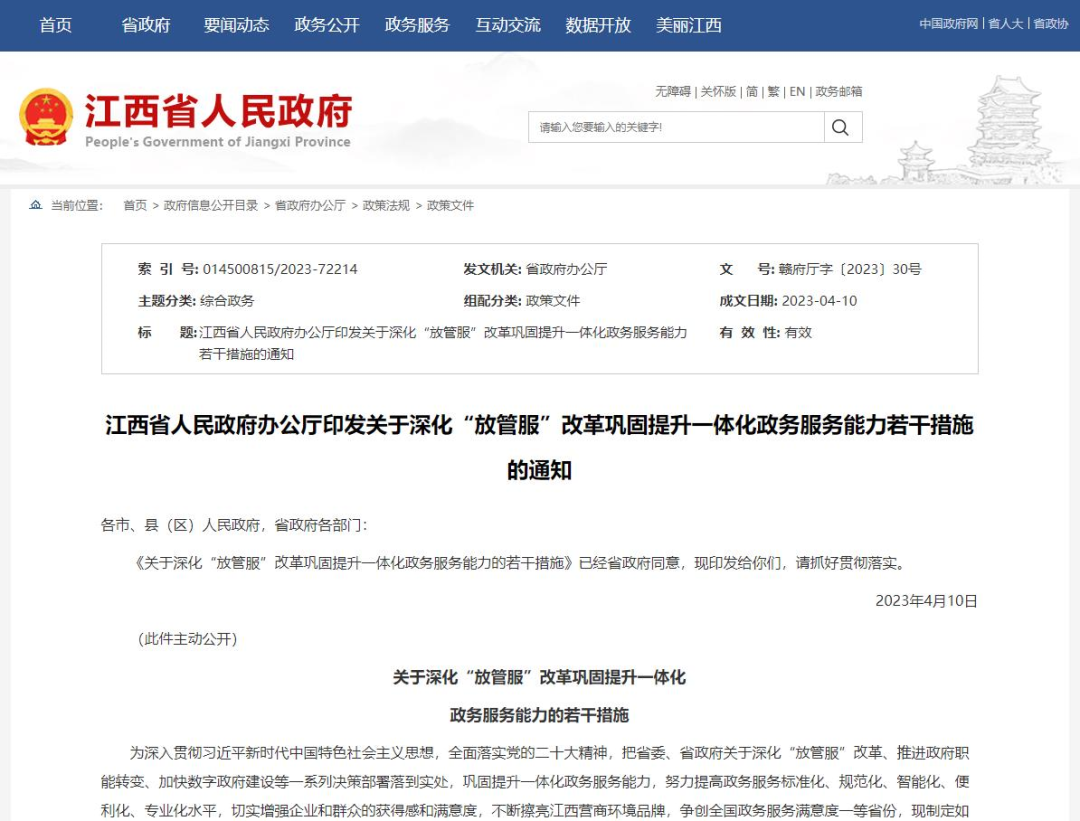 為把省委、省政府關于深化“放管服”改革、推進政府職能轉變、加快數字政府建設等一系列決策部署落到實處,鞏固提升一體化政務服務能力,努力提高政務服務標準化、規范化、智能化、便利化、專業化水平,切實增強企業和群眾的獲得感和滿意度,近日,江西省人民政府辦公廳印發了《關于深化“放管服”改革鞏固提升一體化政務服務能力的若干措施》。